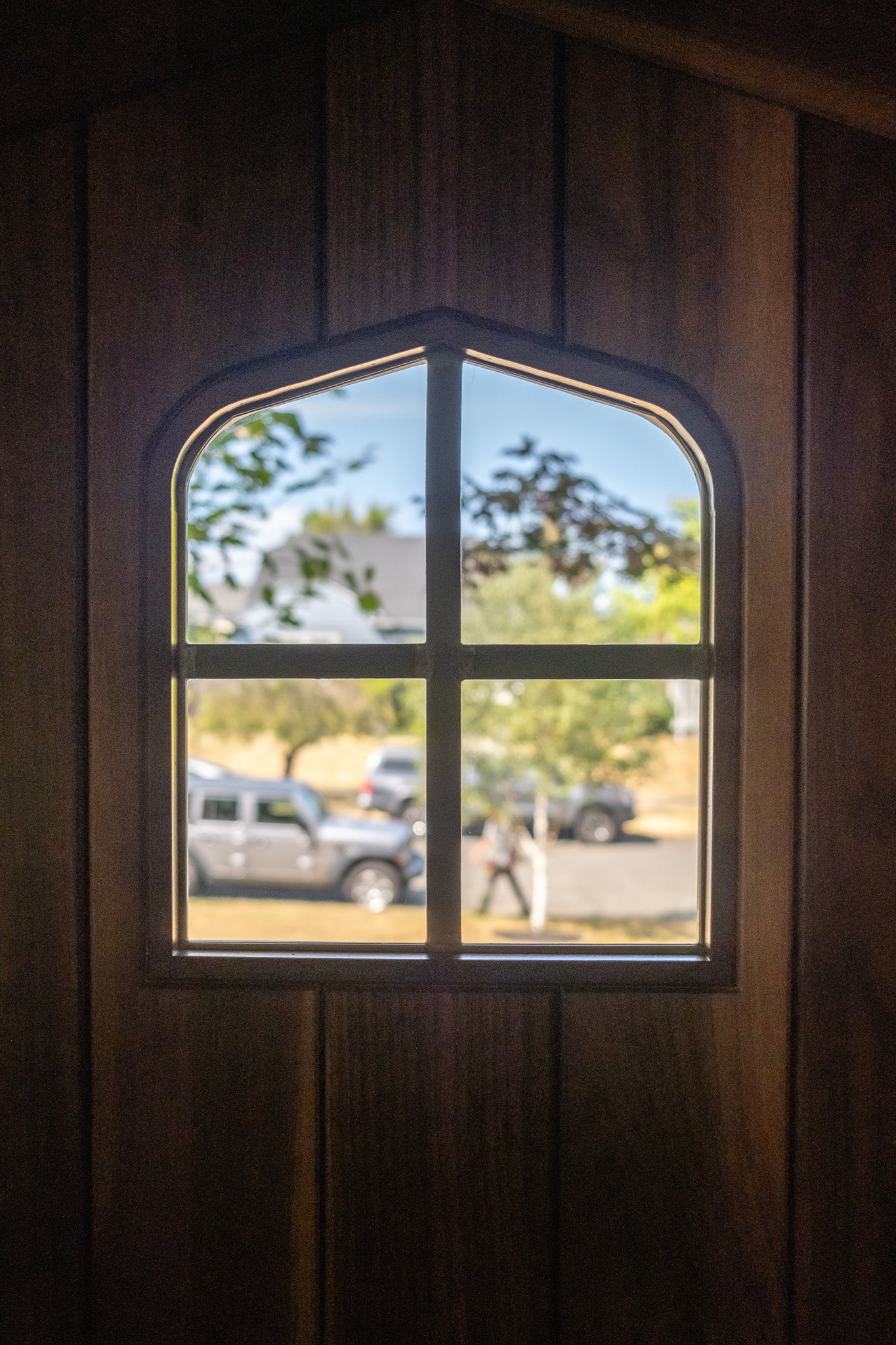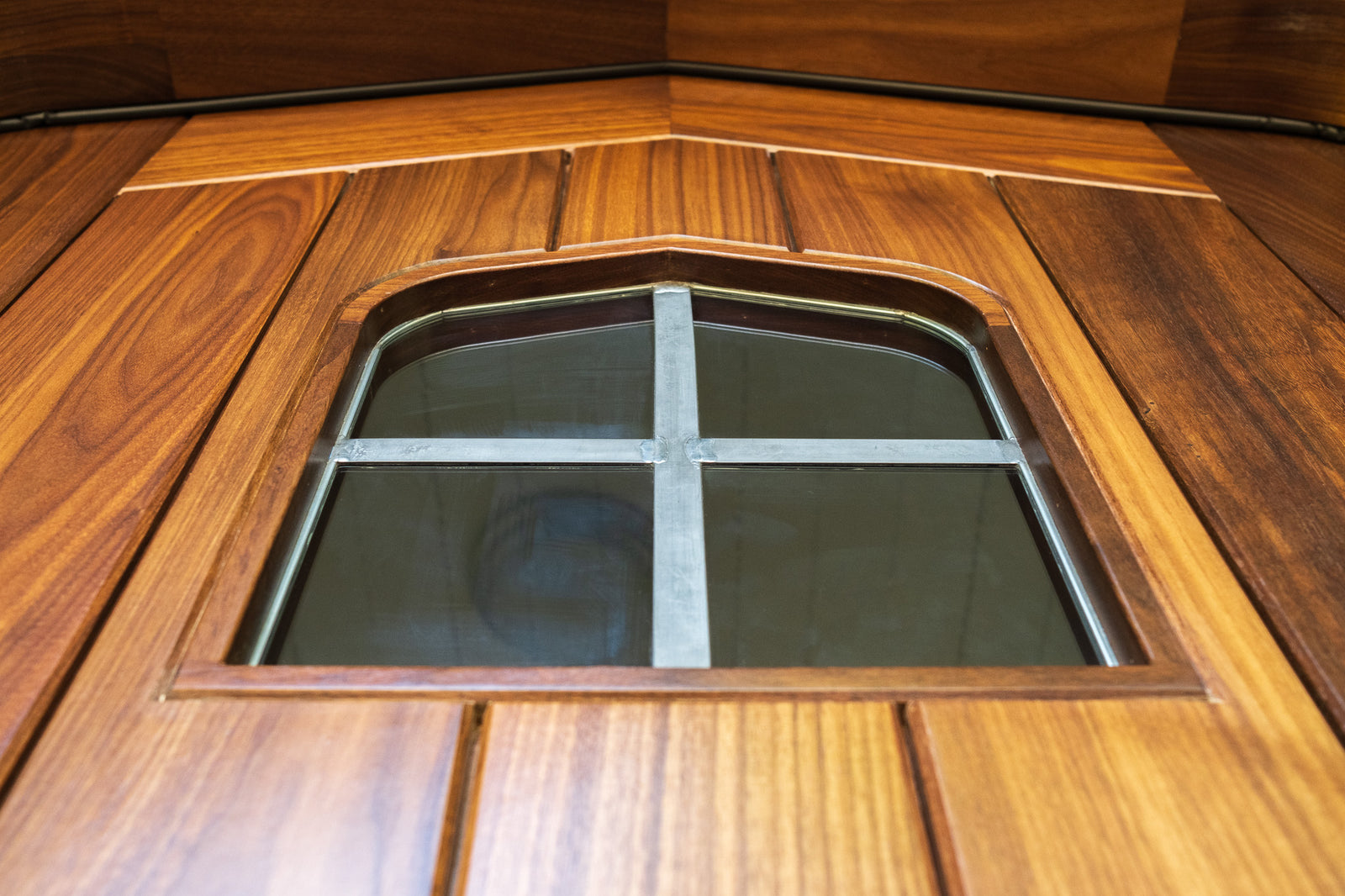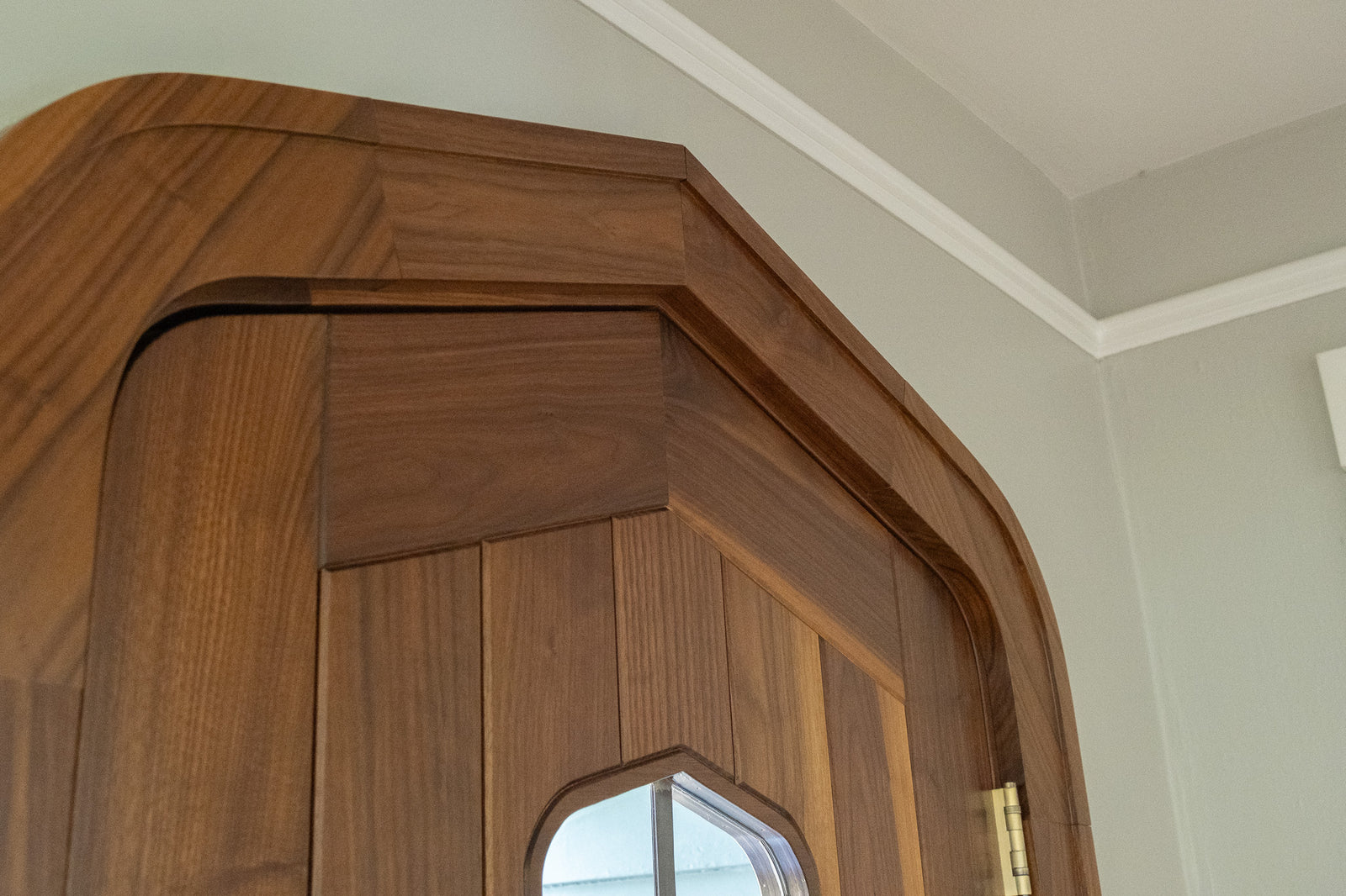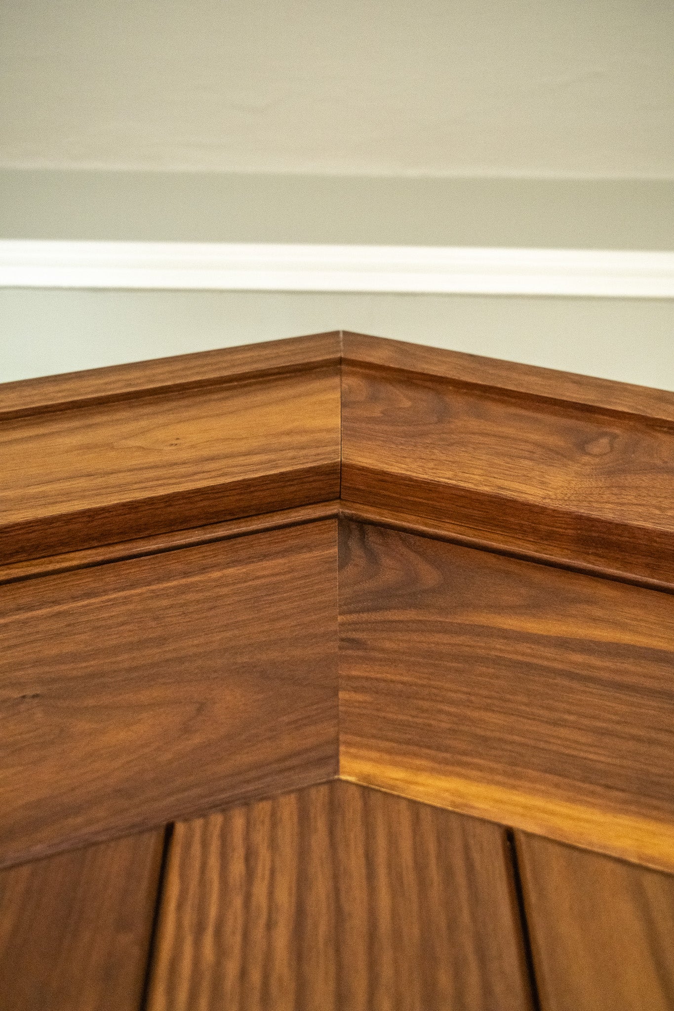 He chose black walnut wood, a wood species known for its rich brown and golden tones. For a traditional touch, he added a small leaded glass window.