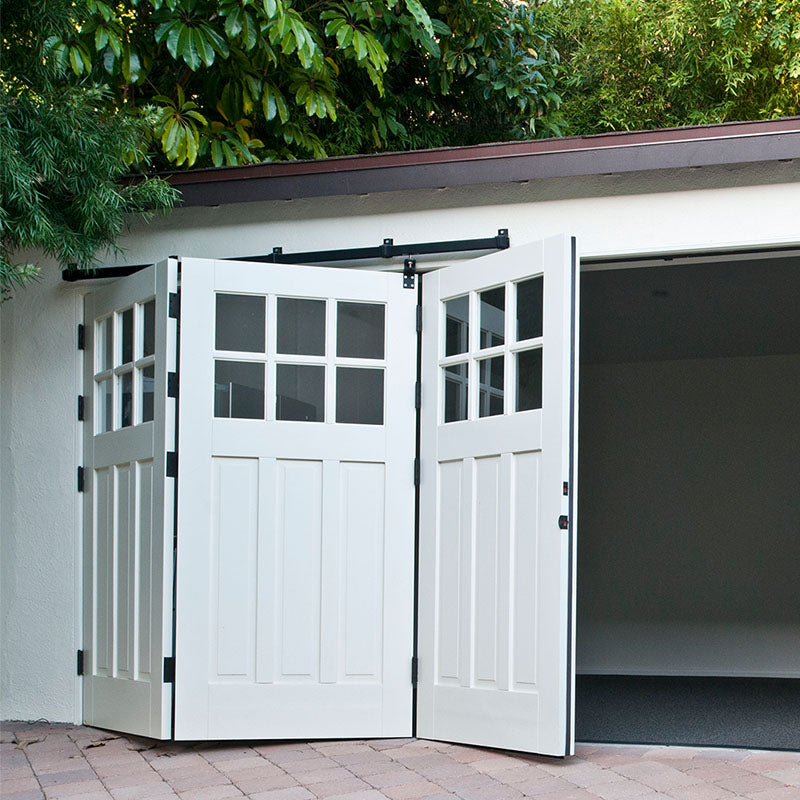 Carriage doors need clear driveway space equal to the door width (typically 8-9 feet per door leaf) when fully open. This means about 16-18 feet of clear space in front of a standard two-car garage. If space is limited, consider bi-fold carriage door designs.