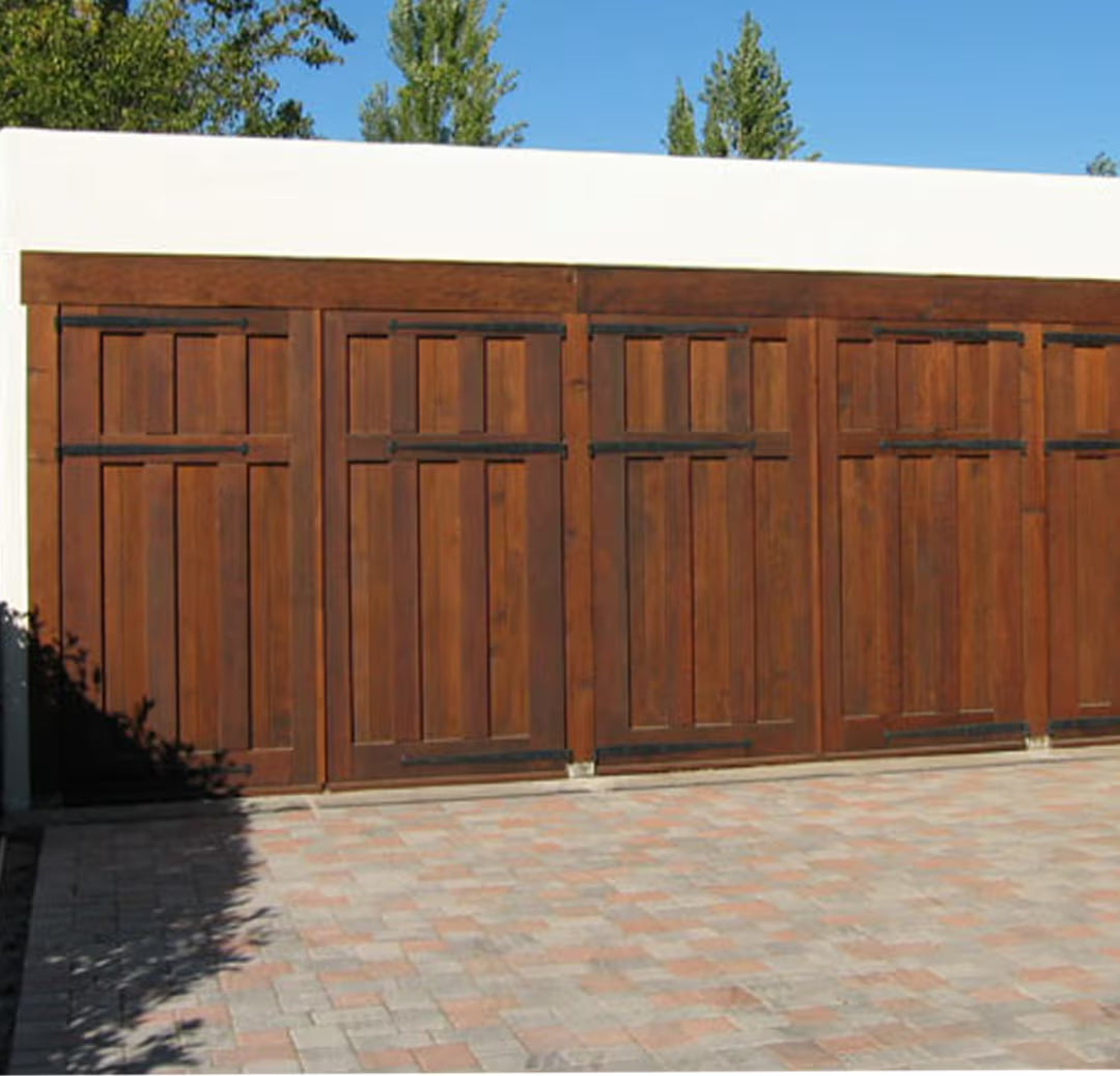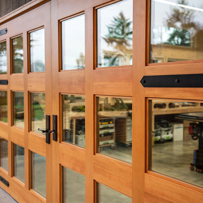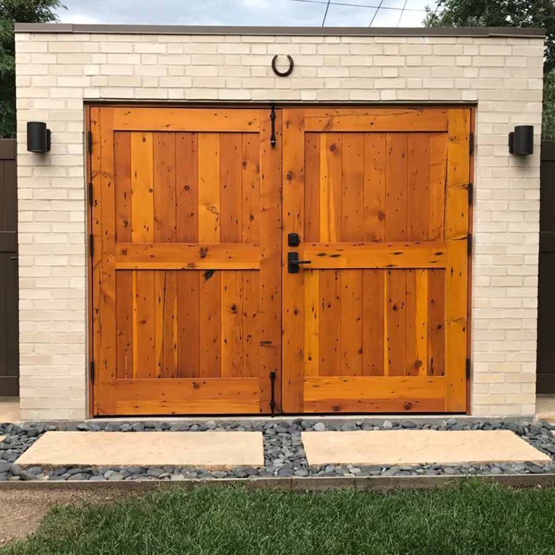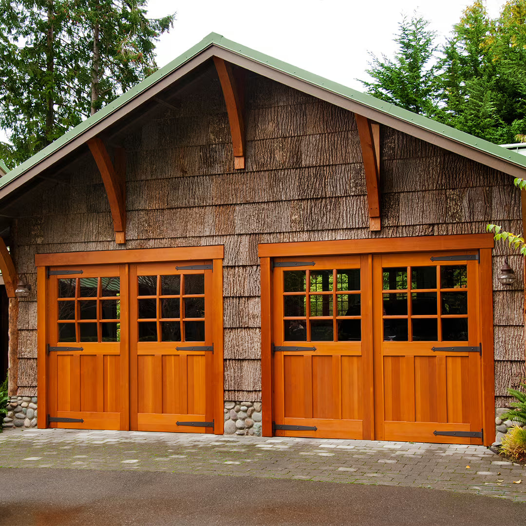 Western Red Cedar and White Oak are popular for their natural durability and weather resistance. Black Walnut offers rich color for modern designs. Douglas Fir is ideal for very large doors. For coastal environments, Mahogany or Sapele provide excellent moisture resistance. RealCraft offers 20 wood species for carriage doors.