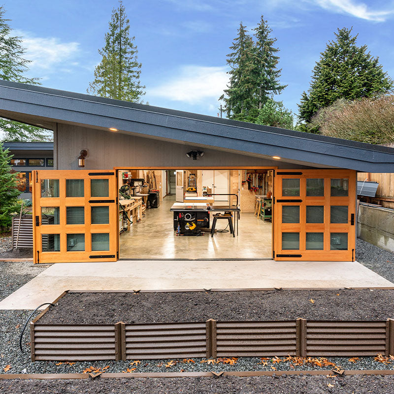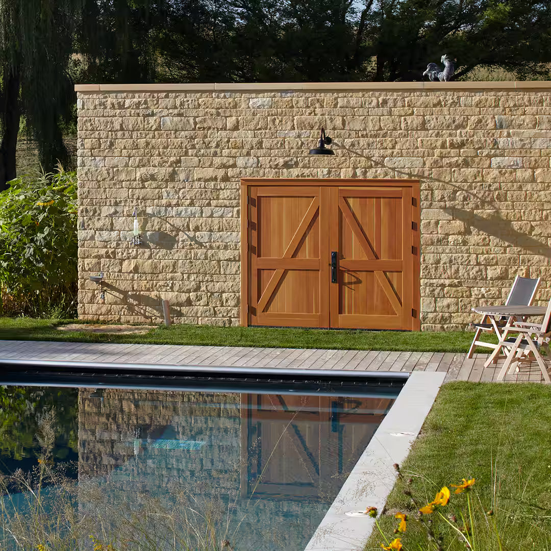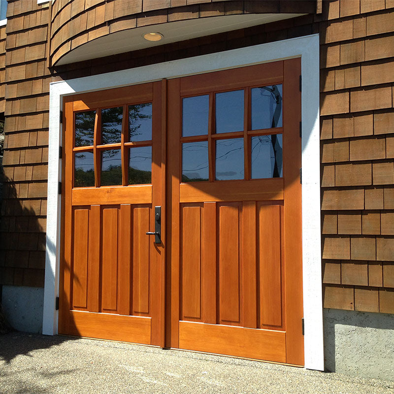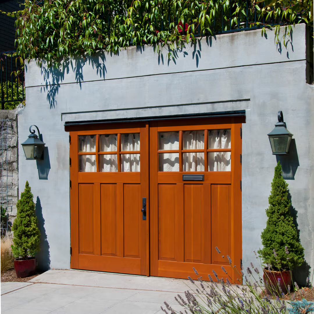 Western Red Cedar and White Oak are popular for their natural durability and weather resistance. Black Walnut offers rich color for modern designs. Douglas Fir is ideal for very large doors. For coastal environments, Mahogany or Sapele provide excellent moisture resistance. RealCraft offers 20 wood species for carriage doors.